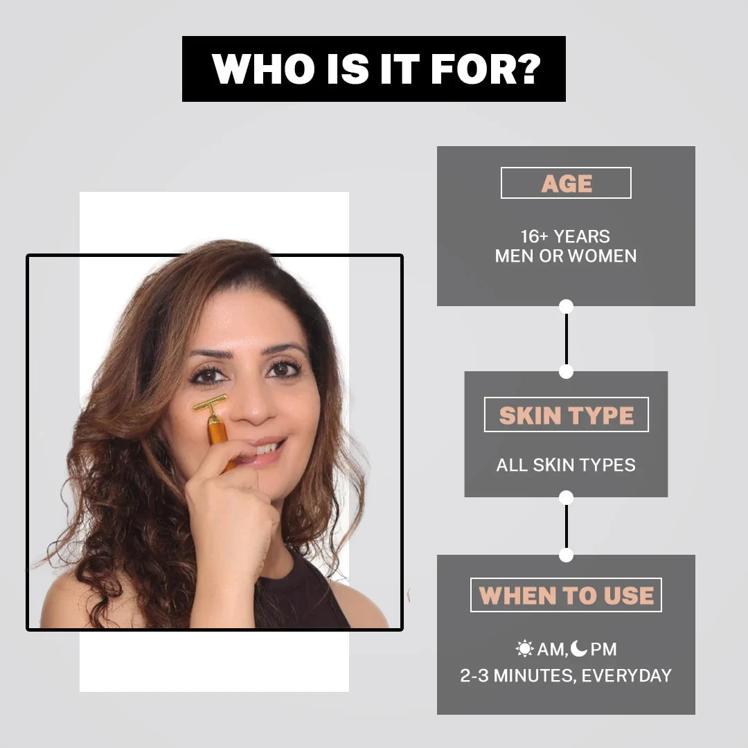 Experience an instant facelift This isn’t just a gadget — it’s a targeted beauty booster. The 24K gold-plated T-bar and 6,000 micro-vibrations work together to stimulate circulation, activate skin cells, and promote collagen-friendly micro-massage.